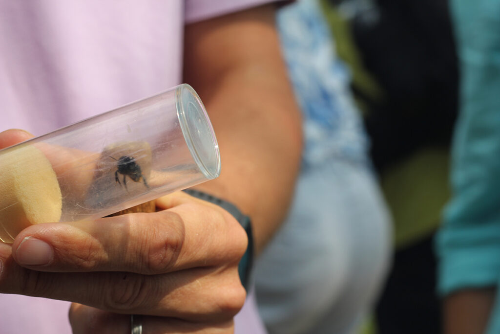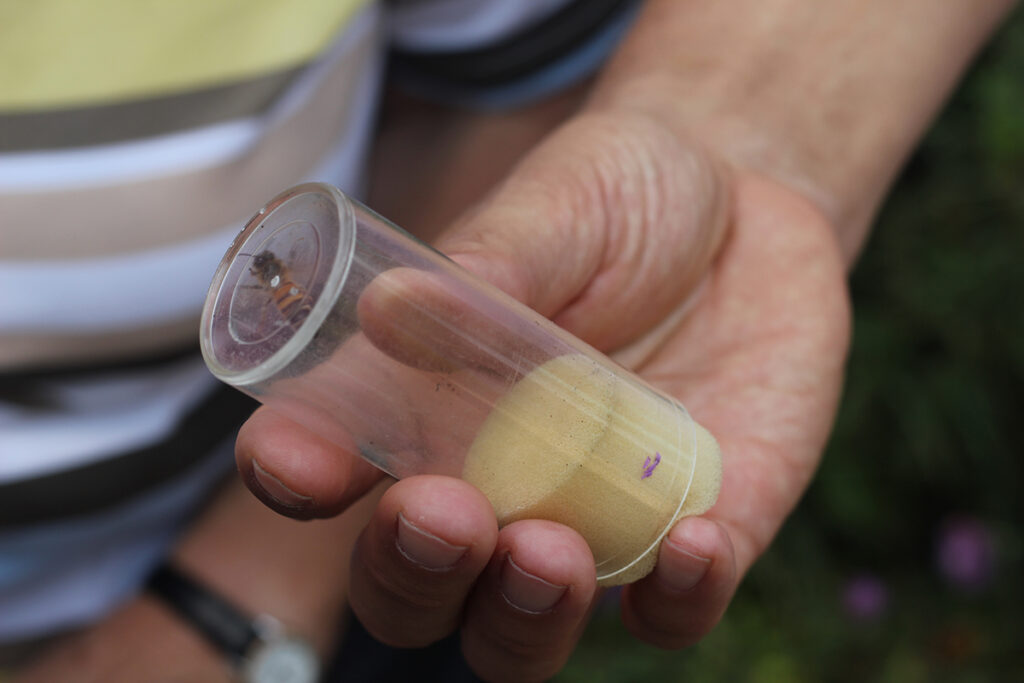 Ein zentrales Thema der Exkursion war die Bedeutung geeigneter Pflanzen – nicht nur in Schutzgebieten, sondern auch in privaten Gärten. Besonders Glockenblumen spielen eine wichtige Rolle. „Bei uns gibt es fünf Wildbienenarten, die ausschließlich an Glockenblumen Pollen sammeln: 3 Scherenbienen, 1 Sägehornbiene und 1 Schmalbienenart“. Wer diese Pflanzen im Garten ansiedelt, könne mit etwas Geduld schon nach 1 bis 2 Jahren spezialisierte Wildbienen beobachten.