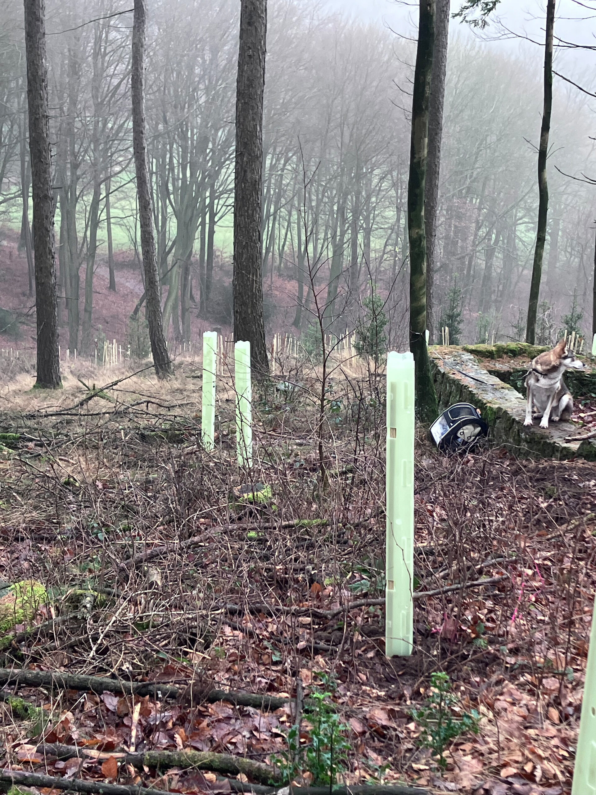Perfektes Wetter fürs Einpflanzen: Denn es war feucht und kühl. Nach ungefähr dreieinhalb Stunden waren alle Bäume in der Erde. Bei einigen Bäumen wurden – zum Schutz vor Verbiss von Rehen – Kunststoffhüllen um die Bäume in die Erde gesteckt, bei anderen Bäume reichte es, unbehandelte Holzstäbe neben die Bäume in die Erde einzuschlagen.
