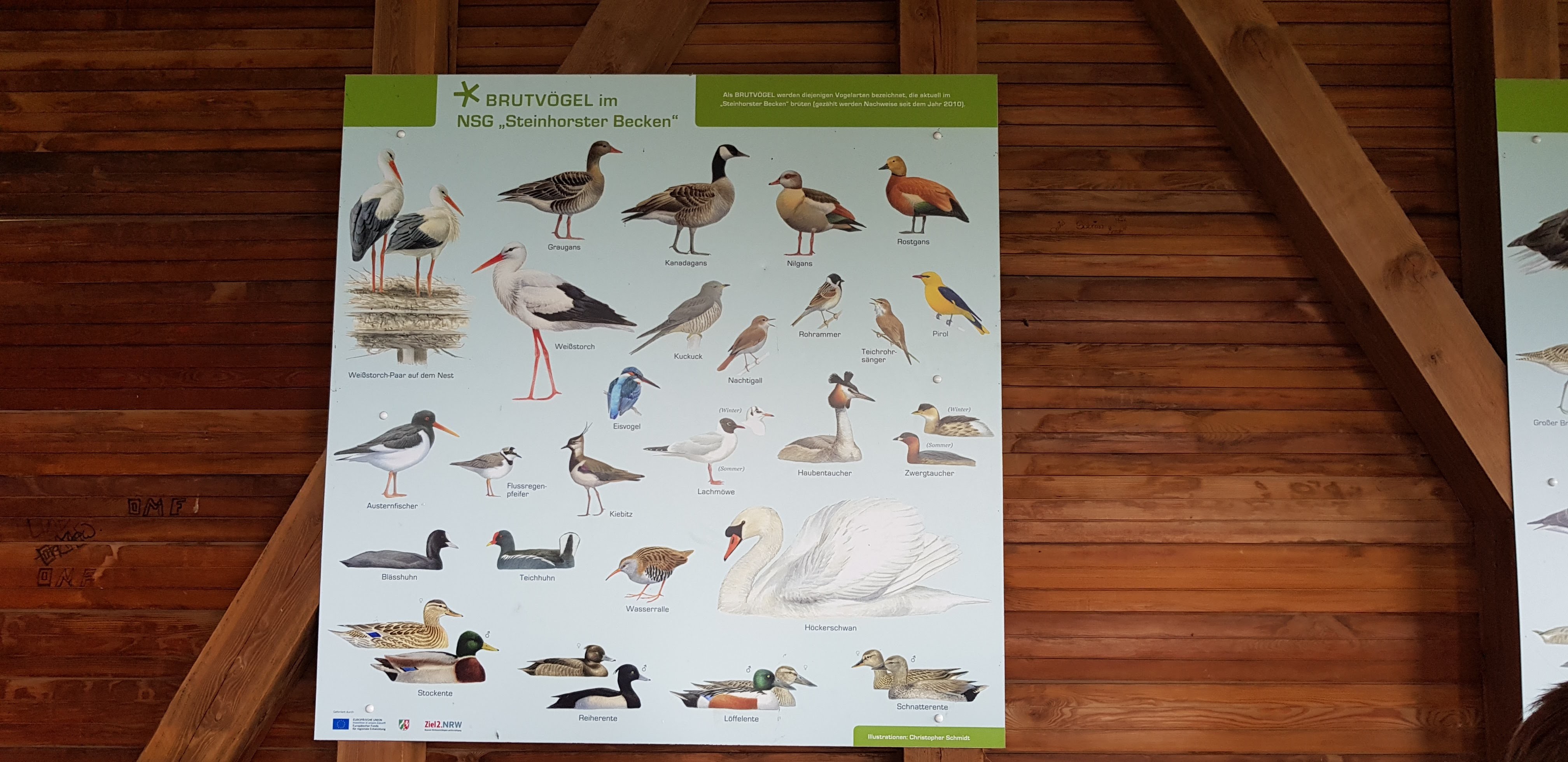 20180414_115438Überwiegend liegt die Wassertiefe bei maximal einem halben Meter, einzelne Bereiche können bis zu zwei Meter tief sein. In diesen flachen Wasserbereichen fanden sich sehr schnell eine Vielzahl von Vögeln ein, die auf diese Art Lebensraum spezialisiert sind. Welche das sind, ist auf den Schautafeln auf den Aussichtsplattformen des Beckens zu sehen.