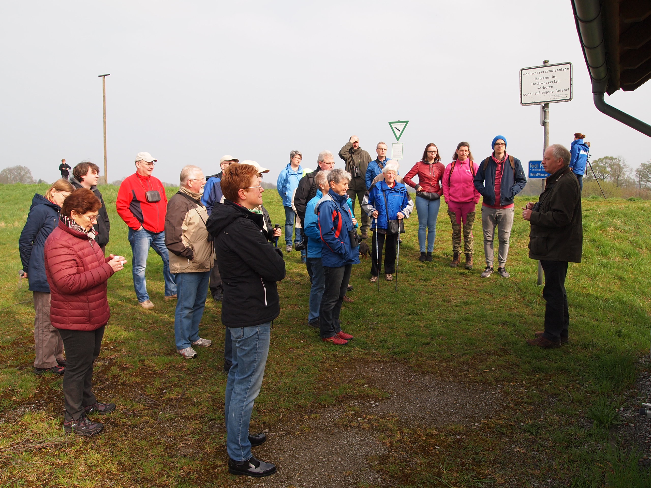 OLYMPUS DIGITAL CAMERADr. Lackmann erläuterte zunächst die Entstehungsgeschichte des Beckens, das ursprünglich als Hochwasserrückhaltebecken geplant war und diese Funktion auch heute noch als wichtigste Funktion erfüllen muss. Nach dem verheerenden Hochwasser der Alme und Lippe 1965 hat man im Kreis Paderborn umfangreich Wasserrückhaltemöglichkeiten geschaffen, um die besiedelten Gebiete vor Überschwemmungen zu schützen. An der Ems im Bereich der Kreisgrenze wurden dazu Dämme/Deiche angelegt, die Hochwässer auf den innerhalb dieses Deiches liegenden Ackerflächen aufstauen sollten.