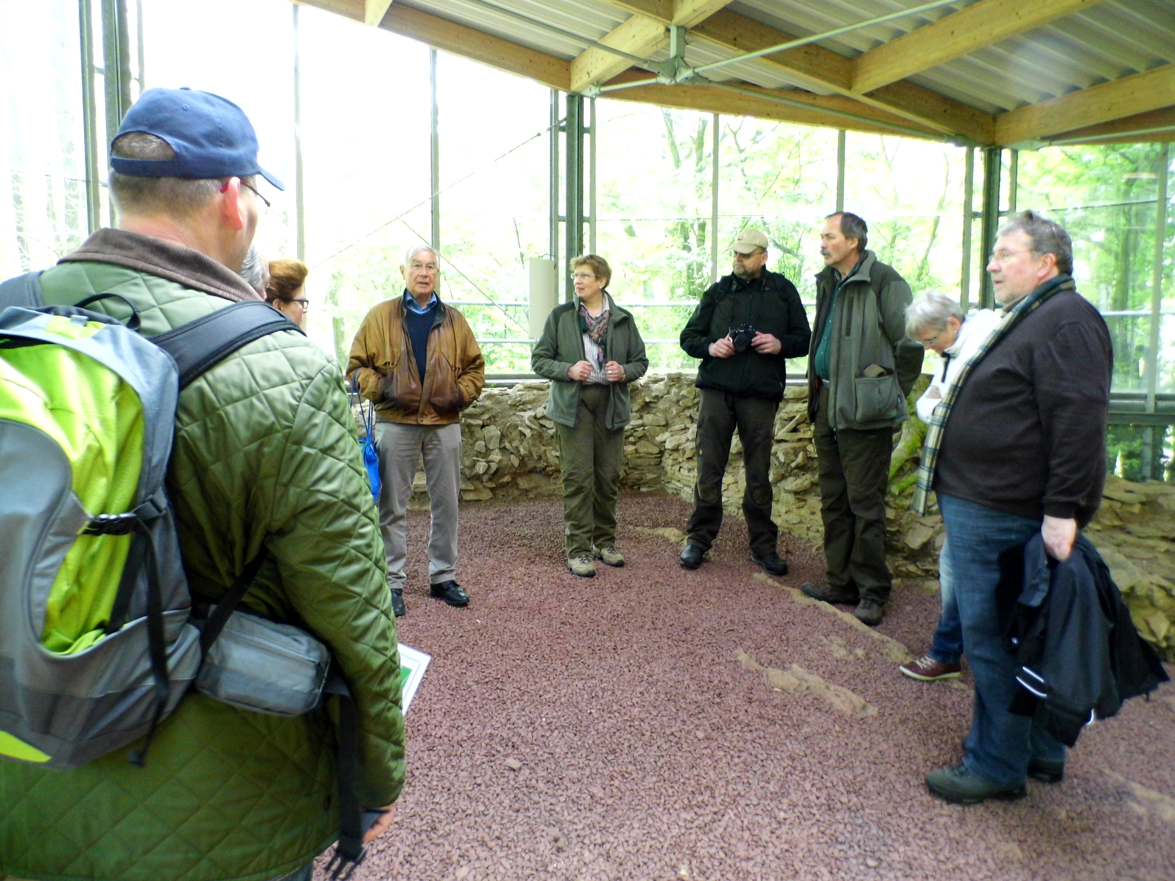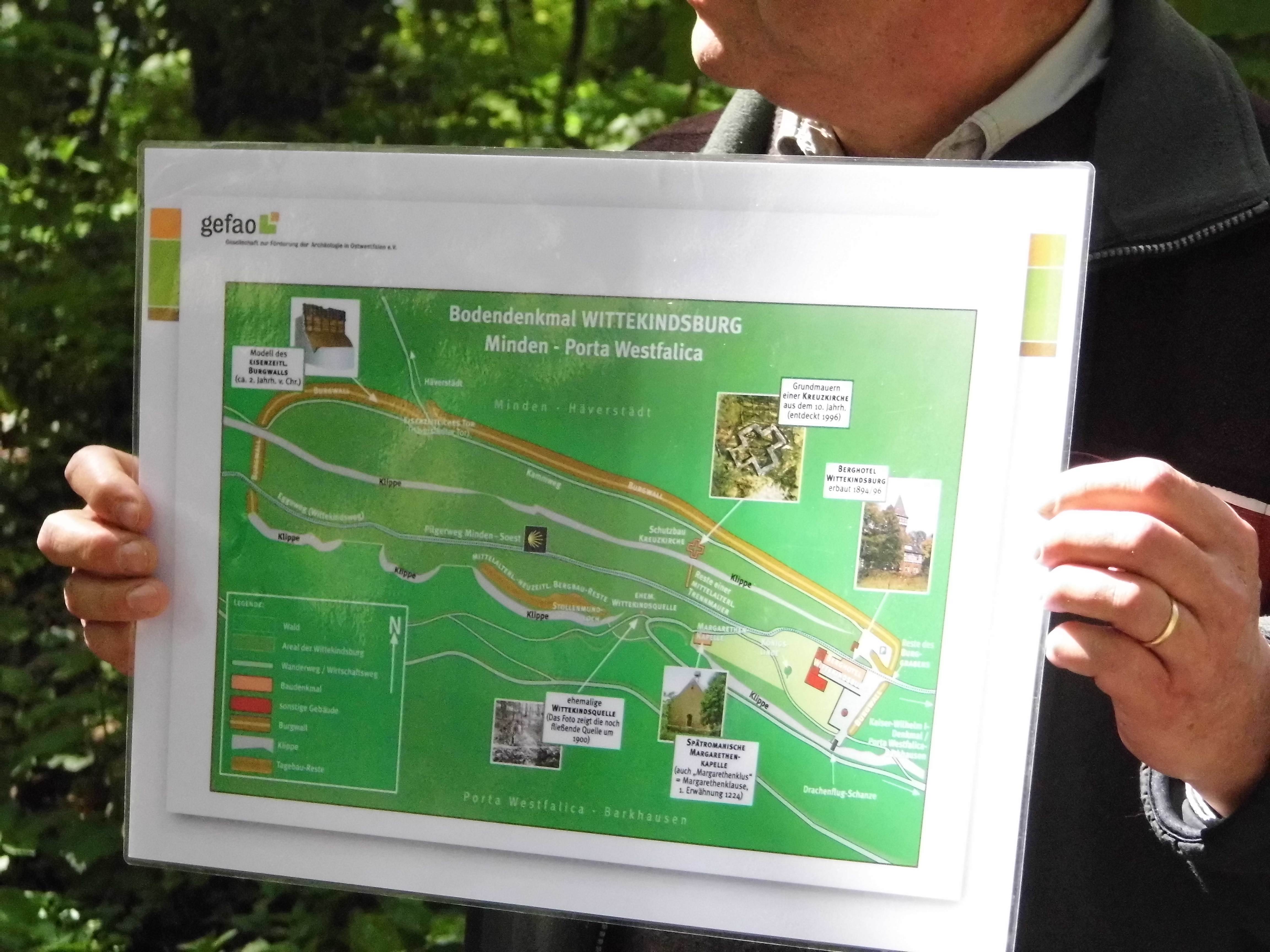 Ziel der Wanderung war die Wittekindsburg, ein Hotelbau, der seit kurzen nach längerem Leerstand von einem Verein übernommen wurde und jetzt wieder renoviert wird. Wie uns Herr Schünemann vom Förderverein Wittekindsberg erläuterte, steht dieses Gebäude auf einem von mehreren möglichen Standorten von frühzeitlichen Burgen, von denen aber nur Verteidigungswälle oder einzelne Torsituationen nachgewiesen sind. Nicht weit von dem Hotelbau wurden 1995 zufällig Mauerreste eine kreuzförmigen Kirche gefunden. Über das Entstehen und die Witmung dieser Kirche weiß man nichts genaues, allerdings wurde dieser Grundriss nur in wenigen Fällen verwendet. Innerhalb der Mauern fanden sich Gräber, nachgewiesen als eine Frau und 4 leibliche Kinder unterschiedlichen Alters. Über die soziale Herkunft weiß man nichts.